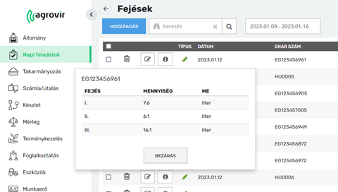 A napi egyszeri tej nyilvántartása bővült, napi háromszori fejés adatainak tárolására van lehetőség, melyek a fejések menüpontban az információs gomb megnyomásával római számokkal kerülnek megjelenítésre.