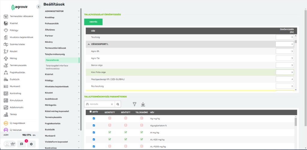A beállítások, talajtermékenyég, paraméterek felületen van lehetőség beállítani, hogy milyen talajvizsgálati adatokat szeretnénk rögzíteni a rendszerben. Ugyan ezen a felületen lehet megadni cégenként a talajvizsgálatok érvényességi idejét.