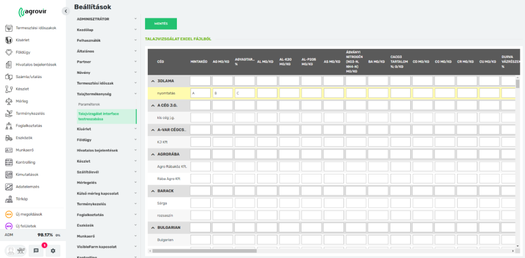 A beállítások, talajtermékenység, talajvizsgálat interface testreszabása felületen van lehetőség beállítani az Excel import oszlopsorrendjét.