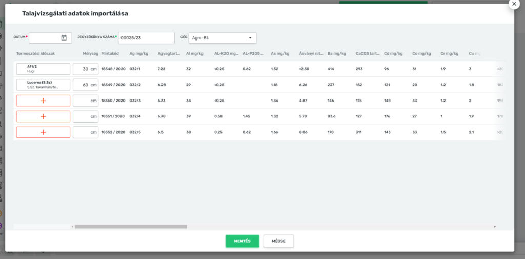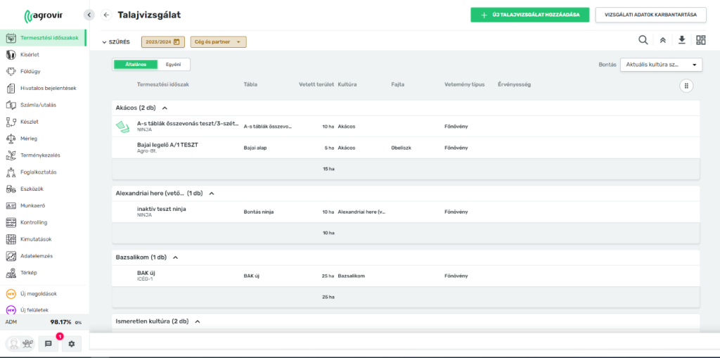 Termesztési időszakokként van lehetőség talajvizsgálati adatot rögzíteni