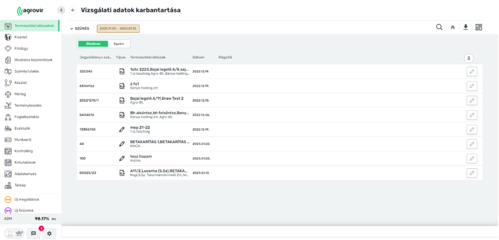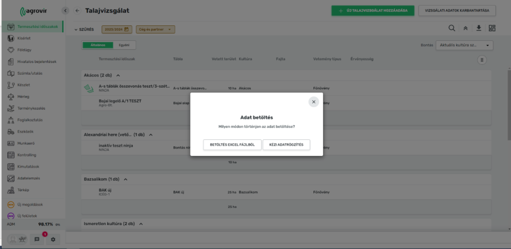 A termesztési időszakok, Talajvizsgálat felületen lehet megtekinteni a rögzített vizsgálati eredményeket, illetve erről az oldalról lehet adatot rögzíteni.