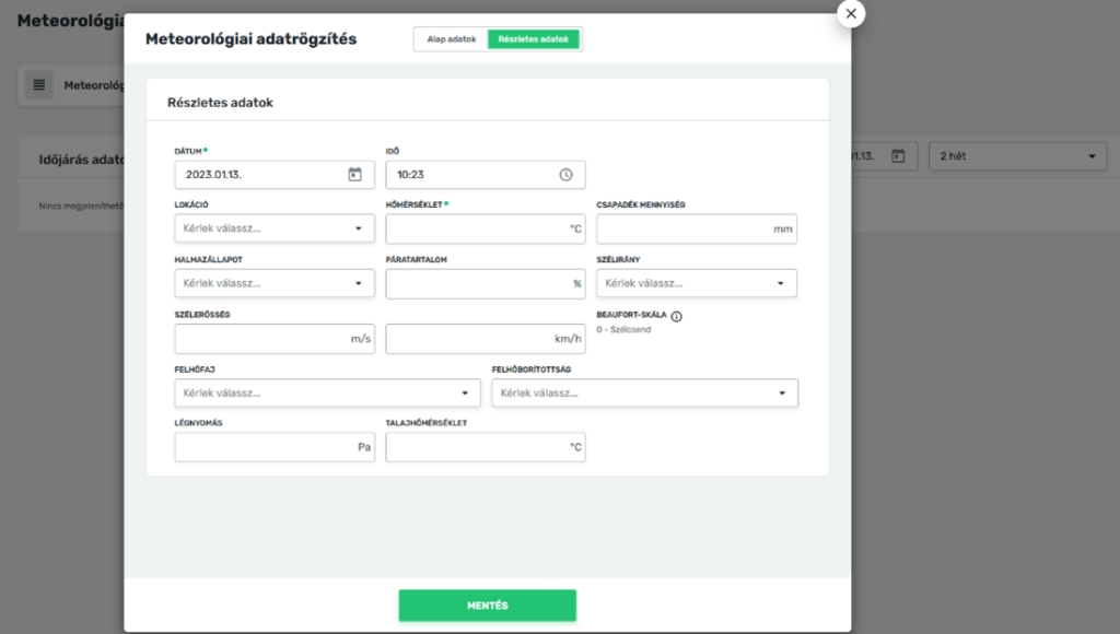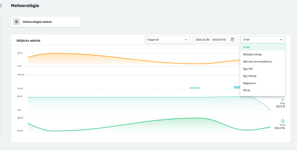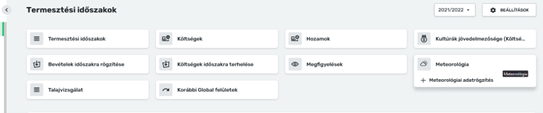 Új lehetőségként megjelenik a meteorológiai adatok rögzítésére szolgáló menüpont a “Termesztési időszakok” főmenüben. A menü folyamatos fejlesztés alatt van, így a jelenlegi állapota nem végleges.