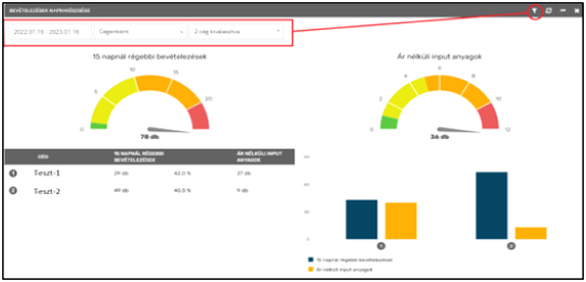 Új widgetként a kezdőlapra kitehető a „Bevételezések naprakészsége” diagram. Amely vizsgálja a bevételezések darabszámát a bizonylat dátuma és a rögzítés dátuma között eltelt idő alapján. Valamint megjeleníti a beárazatlan tételek számát. Jelenleg a növénytermesztési input anyagokat vizsgálja a program, nem a termék csoportokat.