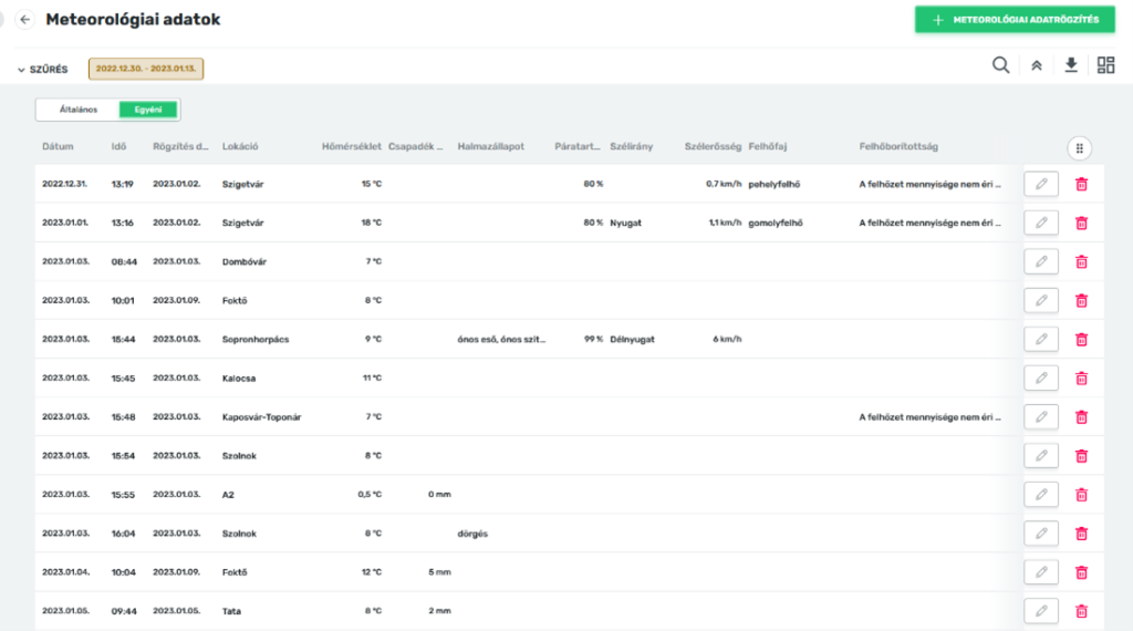 Adatrögzítés lehetséges a főmenüből a menügomb lenyíló részéből indítva, illetve a menü táblázatos felületén. Kezdetben rögzítenünk kell a lokációs adatokat, ahol a meteorológiai készülékeink elhelyezkednek, jellemzően települések kiválasztásával. A következőkben ezekhez a helyekhez vihetjük fel az mért értékeket.