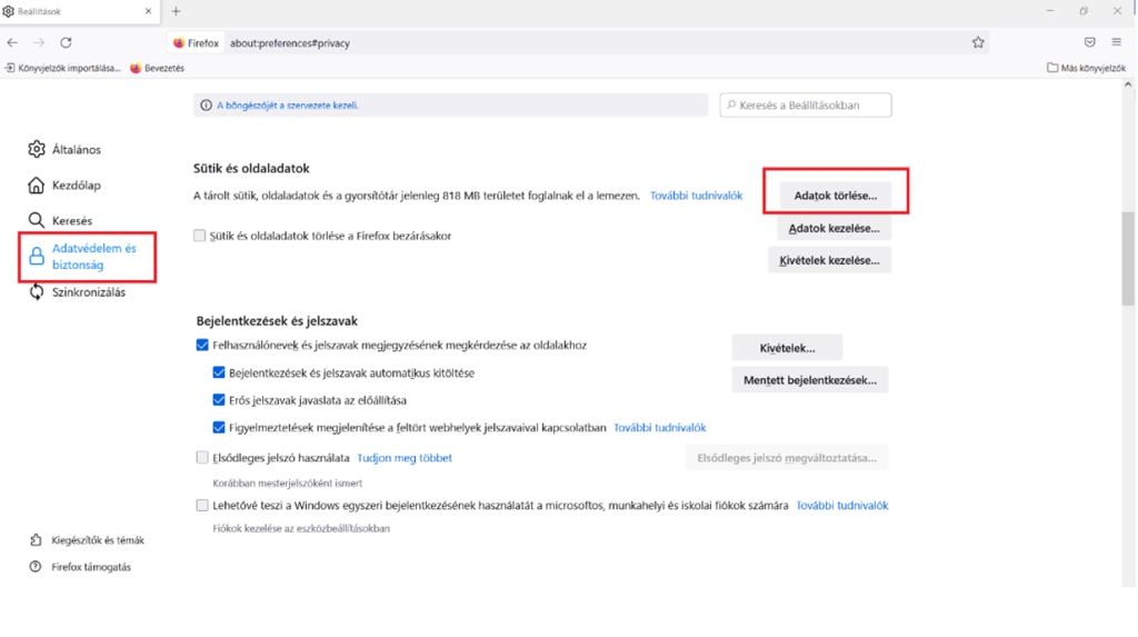 Válasszuk az „Adatvédelem és biztonság” menüt, majd azon belül a Sütik és oldaladatok résznél az „Adatok törlése” gombra kattintsunk.