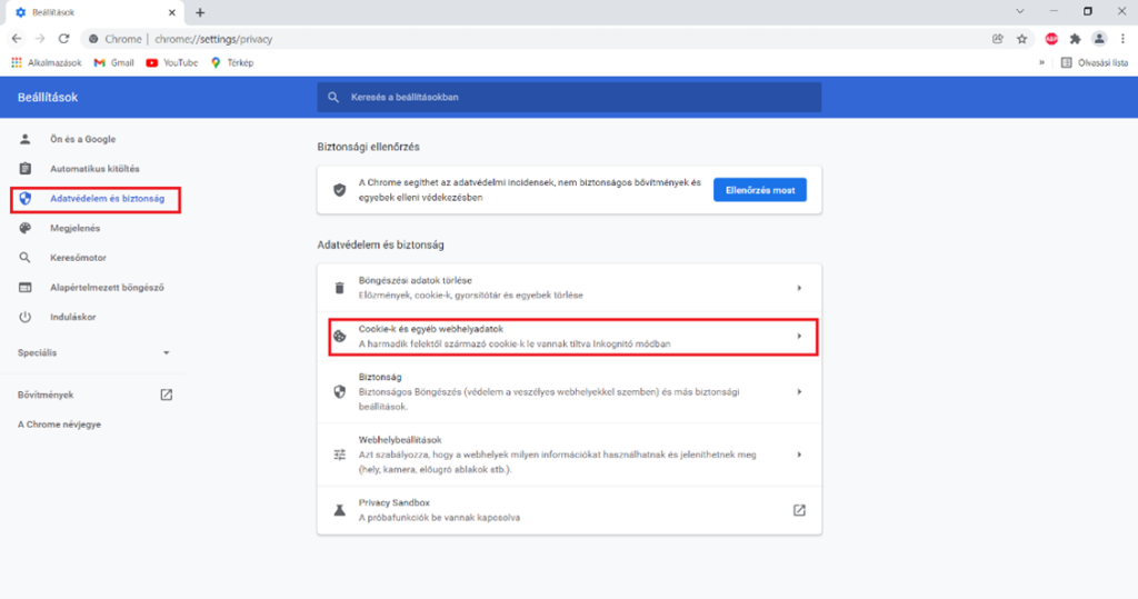 Chrome böngészőben keressük meg a beállítások menüt, ott az „Adatvédelem és biztonság” almenüt.