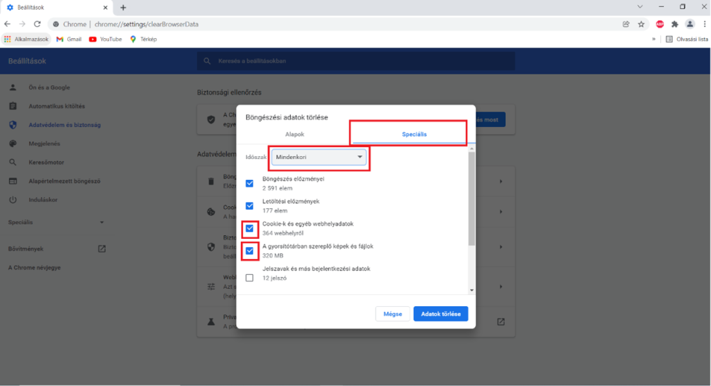 A megnyíló ablakban a „Speciális” részben az időszak lenyílónál minél régebbi időpontig visszamenőleg válasszunk listaelemet. Majd az „Adatok törlése” gombbal fejezzük be a műveletet. Ezt követően indítsuk újra az AgroVIR-t.