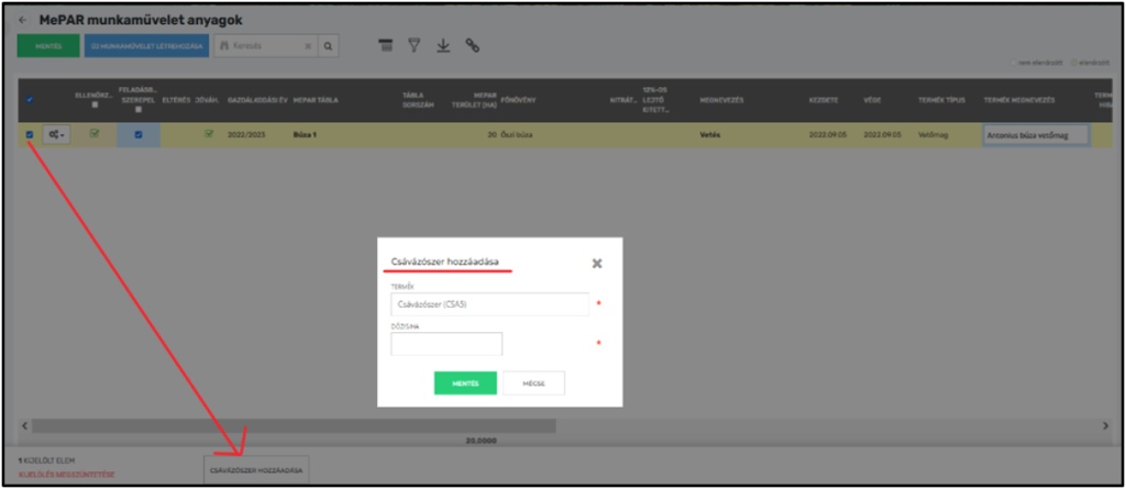 A „Hivatalos bejelentések/MePAR munkaművelet anyagok” felületen a vetőmag típusú termékek esetében hozzáadhatjuk a csávázószert. Ami új soron jelenik meg a MePAR munkaműveleti anyagok felületen. A hivatalos nyomtatványokba is bekerül az így rögzített csávázószer.