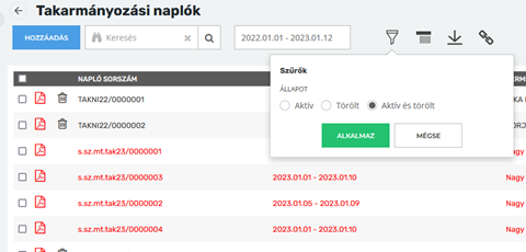 A takarmányozási naplók felületen javítások történtek. Csak úgy, mint más menüpontokban itt is előhívhatjuk a már törölt elemeket a szűrő ikonban felugró beállítás segítségével.