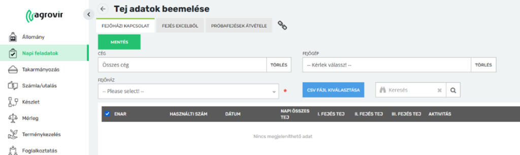 A tej adatok beemelése menüpontban is fejlesztések történtek. A menüpontban három lehetőség áll rendelkezésre a fejésekkel kapcsolatos adatok mentésére. Fejőházi kapcsolat esetén lehetőség van CSV formátumú fájlok importálására is az excel fájlok mellett, valamint próbafejések beemelése is lehetővé vált.
