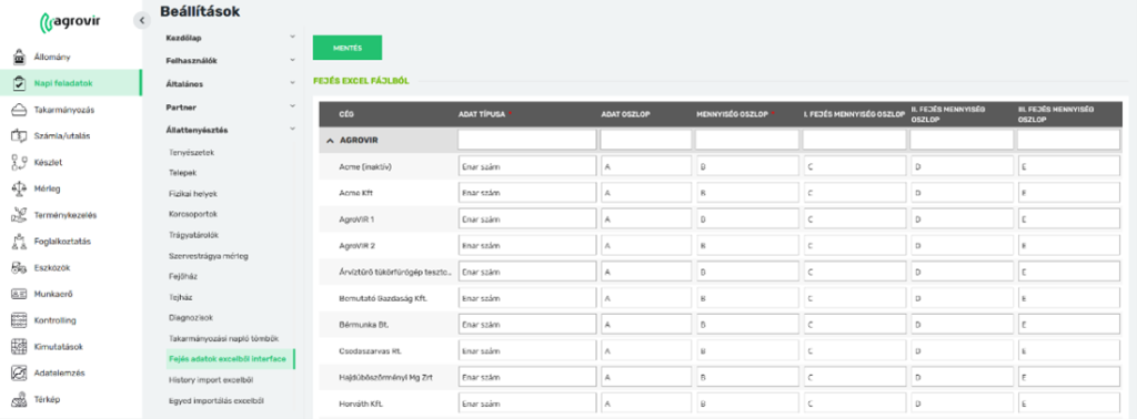Az excel fájlokból való importáláshoz (csak úgy, mint a tankolások mentésének esetében) a megfelelő adatérkeztetés érdekében a “Fejési adatok excelből interface” beállítási menüpontban tudjuk testre szabni az Agrovir érkeztető felületét a táblázatunkhoz.