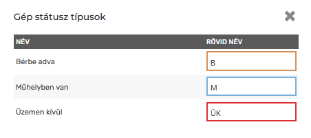 Ez a felület a munkaerőnél található Jelenléti nyilvántartáshoz hasonlóan működik. A gépekre vonatkozó adatokat havi bontásban jelenítjük meg. A gépek státuszát adott napra be lehet állítani (Bérbeadva, Műhelyben van, Üzemen kívül).