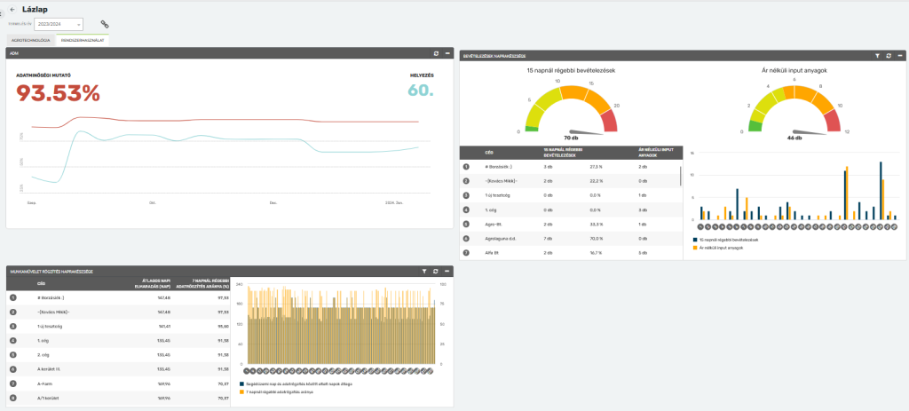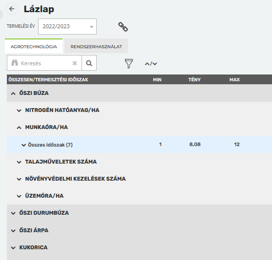 Az “Üzemi elemzések/Saját mutatószámok“ körét bővítettük: a “Lázlappal”. A felületen az “Agrotechnológia” fülön az alkalmazott termelési technológia hatékonyságát jelenítjük meg kultúránként. A felületen található minimum és maximum értékek szakértő által meghatározottak.