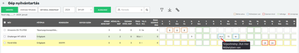 Ezenkívül a segédüzemi rögzítésből gyűjtjük az adott napokhoz tartozó gép teljesítményeket. Ha van státusz és gép teljesítmény is rögzítve az adott géphez adott napon, akkor a rubrika széle színeződik ki a státusznak megfelelően. Ha ráállunk a kurzorral segítő üzenetben megjelenik az adott napra rögzített adat.