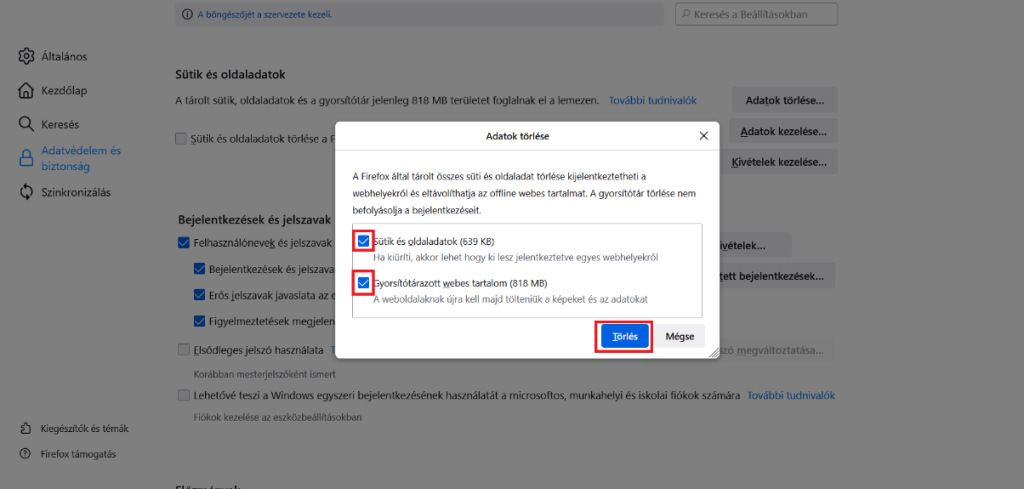 Válasszuk az „Adatvédelem és biztonság” menüt, majd azon belül a Sütik és oldaladatok résznél az „Adatok törlése” gombra kattintsunk.