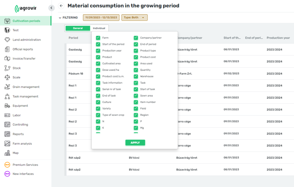 In addition, the ” Cultivation periods/Material usage ” and ” Cultivation periods/Tasks ” interfaces have been extended to include a “Custom” display.