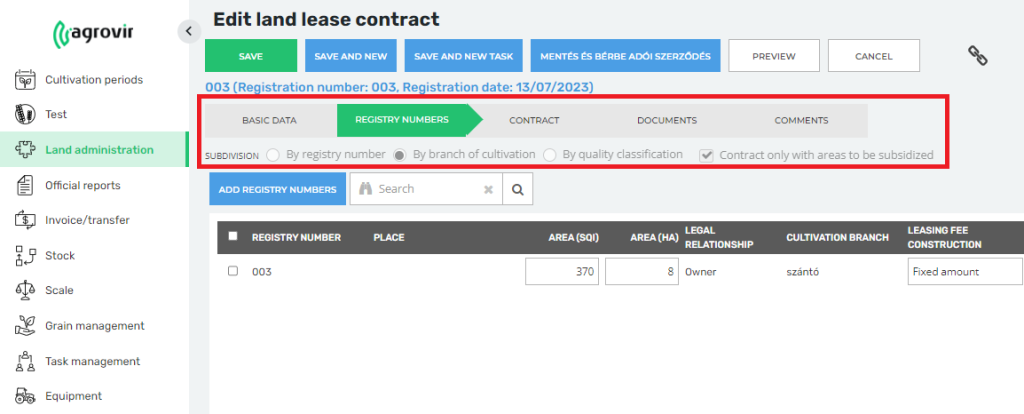We have the opportunity to record land leases only with subsidised area. We can set this in general in the “Settings/Land administration customisation” menu.