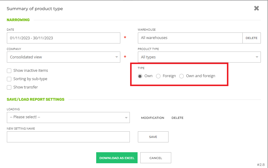In the case of the “Product type value summary” (#2.8) report, in the request window we can control the display of the transfers. Based on type, we can set whose inventory we want to retrieve.