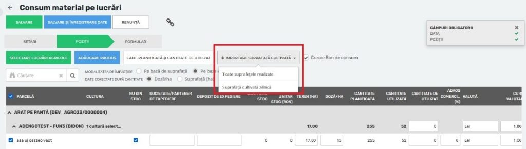 - „Suprafața cultivată zilnică”, opțiune care încarcă doar suprafețele realizate în ziua înregistrării consumului.