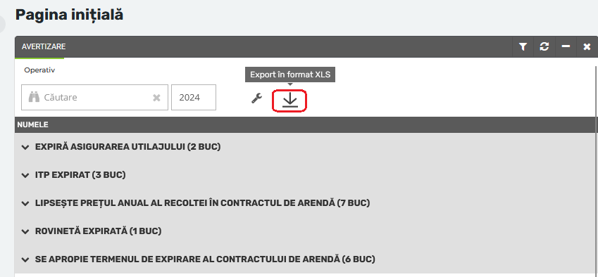 Este posibilă de acum descărcarea în fișier de format Excel a avertizărilor afișate pe interfața “Pagina inițială”.