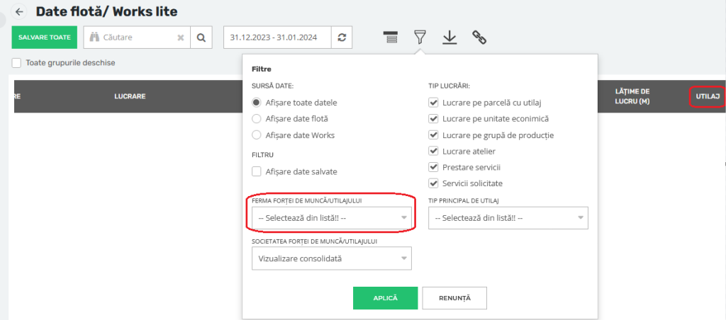 Interfața “Lucrări agricole / Date flotă” a fost extinsă cu posibilitatea de filtrare a datelor afișate după “Ferma forței de muncă / utilajului”, respectiv a fost adăugată o coloană nouă de date “Utilaj”.