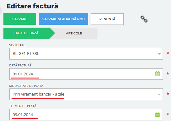 Interfețele privind înregistarea facturilor oferă de acum facilitatea de completare automată a câmpurilor “Termenului de plată”, calculat pe baza “Datei facturii” și a “Modalității de plată” selectate. “Termenul de plată” este deci propus, dar acesta poate fi în continuare editat manual de către utilizator.