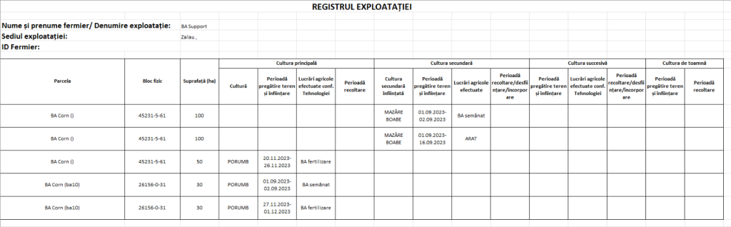 Interfața “Formulare oficiale” a fost extinsă cu situația “Registrul exploatației”. Acest document se poate descărca în format Excel și conține date înregistrate în meniul “Documente oficiale” legat de parcele APIA, lucrări agricole, materiale și randament.