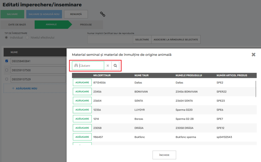 În cazul utilizării înregistării individuale a animalelor, la sarcina zilnică de tip împerechere / înseminare, materialul seminal poate fi selectat dintr-o listă. Cursorul este poziționat implicit în câmpul de căutare.