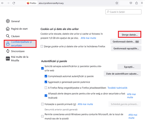 Selectați meniul „Confidențialitate și securitate”, apoi acționați butonul ” Șterge datele” din secțiunea „Cookie-uri și date ale site-urilor”.