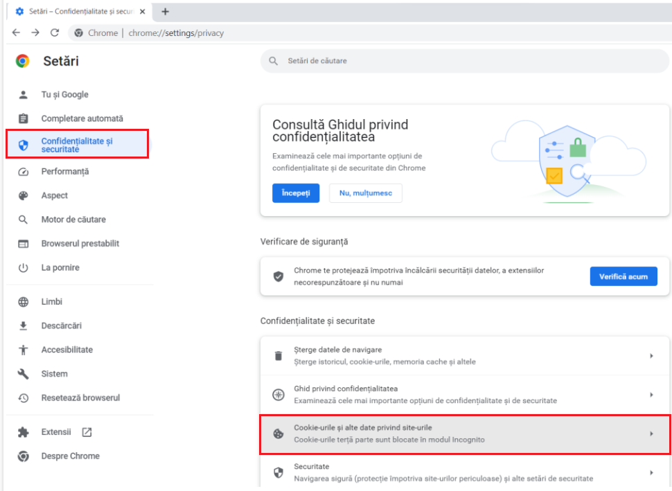 În browserul Chrome, accesați meniul „Setări” și selectați submeniul „Confidențialitate și securitate”.